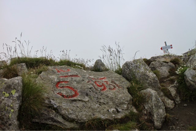 Det var en väldigt regnig natt. Det började dock att lugna sig fram på små timmarna och när jag började packa samman så var det endast ett lätt duggregn. Hela förmiddagen kom och gick duggregnet och dimman låg stundtals väldigt tät. Vi började dagen med att gå upp till Alpe di Laghetto, 2046 möh. Därefter dagens första pass, Passo di Campo, 2204 möh. Vi gick vidare förbi sjöarna Laghi di Campo och fick därifrån se något väldigt vackert. Två stycken stenbockar med enorma horn uppe på passet Passo Straciugo. Avståndet var dock för långt för att få det på bild. Vi vandrade vidare till nästa pass Passo di Pontima, 2387 möh. Där gick vi in i Schweiz. När vi sedan kom till Alpe pontimia, 2192 möh, sken solen, så då passade jag på att äta lunch. Att solen skulle titta fram idag räknade jag inte med när jag klev ut ur tältet i morse, så en väldigt glad överraskning!